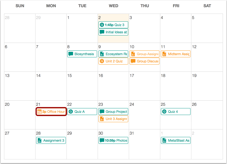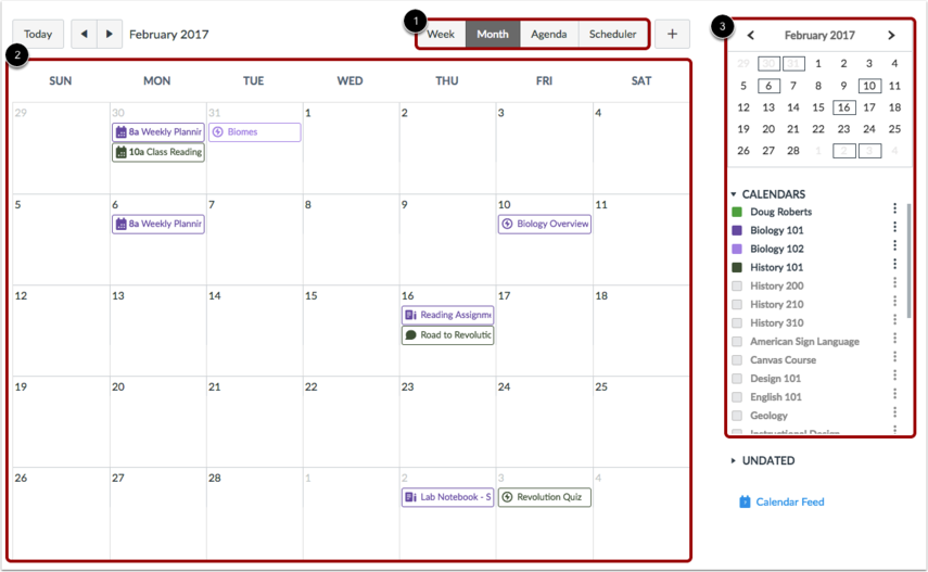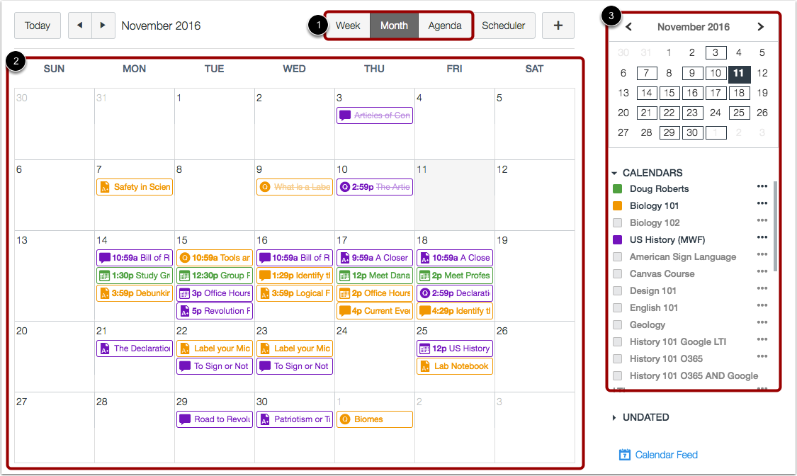 The page in Canvas. Your calendar list includes all courses and communities into which all courses. In the navigation bar, you can choose to view the calendar in Week, Month, Agenda, or Scheduler view. The view you choose dictates the style of the calendar window. By default, ... Retrieve Content