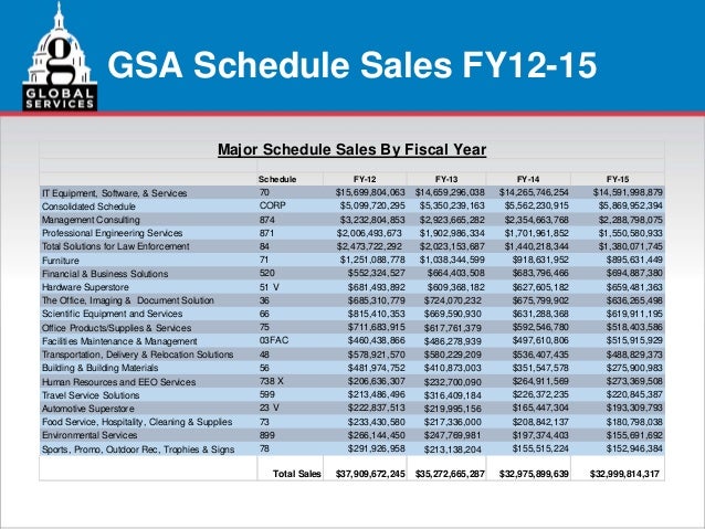 Small Businesses on GSA Fiscal Year 2014 GSA Sales GSA Schedule Description Total GSA Sales Total Small Business GSA Sales # of Small Business GSA Contracts 70 IT $14,148,750,018 $ 899 Environmental Services $340,953,019 ... Retrieve Doc